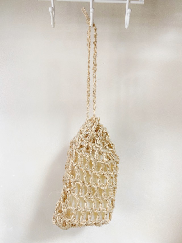 固形石けん派のあなたに。 石けんをより使いやすく、小さくなった石けんも最後まで無駄なく使える、ジュート(麻)素材を使った新地球シリーズの石けんネットです。 ネットに入れて吊るしておくことで石けんの水気を切り長持ちさせてくれます。 自然素材の風合いで、浴室や洗面台に置いてもオシャレ。 固形石けんを愛用する方には、ぜひおすすめしたい一品です。 サイズ 13cm×9cm (手編みなので多少の誤差はご了承ください) 石けんは入っておりません。